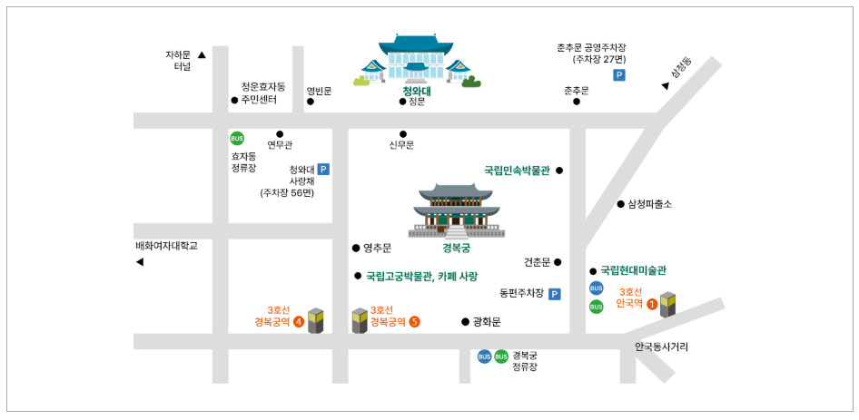 지하철 3호선 경복궁역 4번 출구 → 도보 약 15분