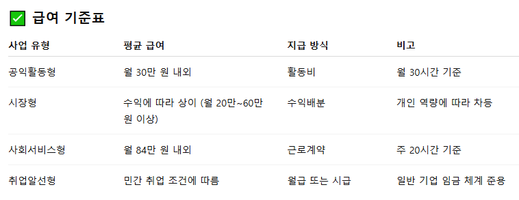 2025년 노인일자리 사업은 크게 공익활동형, 시장형, 사회서비스형, 취업알선형으로 나뉘며, 각 사업 유형별로 수행하는 업무와 급여 수준이 다릅니다.