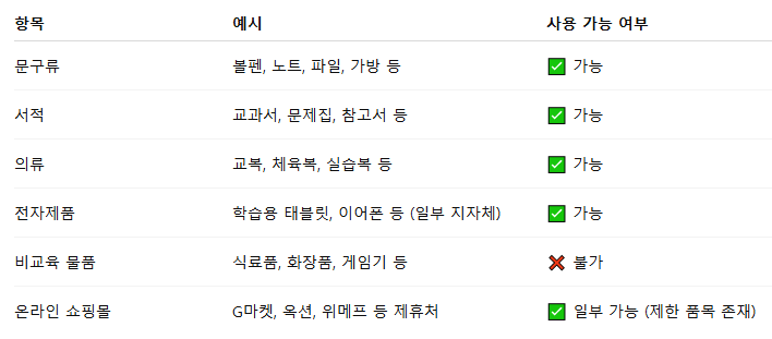 교육급여 바우처는 교육과 관련된 항목에 한정하여 지정된 사용처에서만 사용할 수 있도록 되어 있습니다.