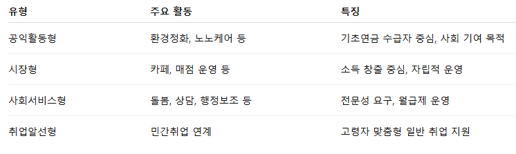 2025년 노인일자리 사업은 크게 공익활동형, 시장형, 사회서비스형, 취업알선형으로 나뉘며, 각 사업 유형별로 수행하는 업무와 급여 수준이 다릅니다.