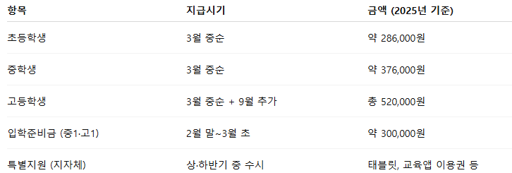🔔 지급일은 지자체별, 학교별로 상이할 수 있으므로 해당 교육청 또는 복지 담당자 확인 필수